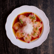Ronde kroketjes van koningskrab, met hun brosse korst en propvol krabbenvlees, zijn niet alleen technisch perfect maar ook magisch lekker. Een "tuna tostada" zijn blokjes blauwvintonijn op een krokante toast, met daarbij guacamole van edamame en een mix van Japanse tare-saus en Mexicaanse salsa macha. Het hoofdgerecht tilt de kwaliteit nog hoger: gegrilde zeebaars in een botersaus met koji, opgefrist met jam van tomaat.
