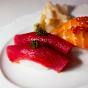 Twee sushimeesters met Aziatische roots staan achter de eettoog vis te versnijden voor de sashimi en sushi die hier geserveerd wordt. Ik bestel een gevarieerde mix van sushi met blauwvintonijn "akami" (het magere deel van de rug, dat ik verkies boven de vettere toro van de buik), zalm, zeebrasem, hamachi en zee-egel, die allerzaligste delicatesse uit de zee. De vis is van onberispelijke versheid en kwaliteit, de gaartijd, temperatuur, bereiding en portionering van de rijst zijn uit het boekje. Voor de vegetariërs is er sushi met avocado, waarbij aan de kwaliteit en versnijding van deze vruchtgroente evenveel zorg werd besteed als aan die van de vis.