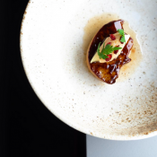 Dezelfde durf en lef legt Bianchin aan de dag wanneer hij gekonfijte aubergine, in een ponzusaus met Japanse citrus en zeewier, samenbrengt met carpaccio van gerijpt Holstein rundsvlees. Vervolgens slaat hij zijn klassiek-Franse reputatie helemaal aan diggelen door de confrontatie van zeebaars met de bittere smaak van Italiaanse puntarelle (familie van witloof en radicchio) en cime di rapa (ook gekend als broccoletti).