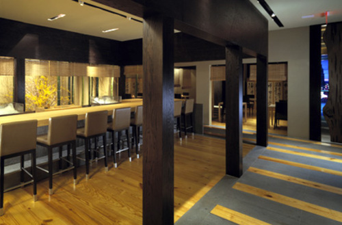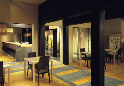 Minimalistisch ingericht Japans restaurant met ingrediënten en gerechten op topniveau.
