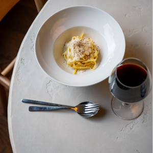 Een tartaar van rode biet (in blokjes en gepekelde schijfjes), paprika, kappers, koriander en wat mosterd mag dan niet traditioneel Italiaans zijn, de elegant gepresenteerde compositie zit goed in elkaar (€ 9,5). De gedroogde ham nero di Calabria, van het gelijknamige lokale varkensras, met het mes à la minute gesneden, is van hoge kwaliteit maar iets te zout naar mijn smaak (€ 15 voor 50 gram). Jammer ook van het banale stokbrood erbij: behalve de fabuleuze focaccia is brood nooit een sterk punt van culinair Italië geweest.