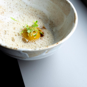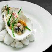 Een van zijn huidige signatuurgerechten is een met nori gerookte holle oester in een gejodeerde vinaigrette, gecombineerd met groene selder en linzen: een botsing van minerale en aardse smaken, die flink wat opwinding veroorzaakt in de culinaire genotscentra. De chef had bovendien het goede idee om de linzen krokant te houden, zodat je er een prettig contrast met de zacht-sappige textuur van de oester bovenop krijgt.